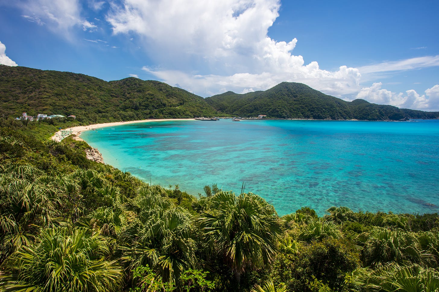 The island’s other main beach, Aharen—which I have heard has a slightly less strict beach guarding regime due to pressure from locals and store owners (a bit of island gossip for you)—attracts significantly more crowds than Tokashiku. Likely, 90% of the people I rode with on the ferry from Naha went to Aharen Beach. It has more of a typical, though not particularly charming, busy beach town vibe. The choice of eateries in Aharen is also much greater than in Tokashiku—one versus ten—making it a more convenient choice for many. Additionally, multiple water sports centers offer snorkeling and kayaking tours to nearby small, uninhabited islands.